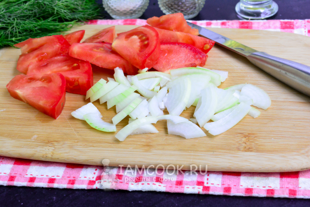 Репчатый лук нарежьте полукольцами, а помидоры - дольками.