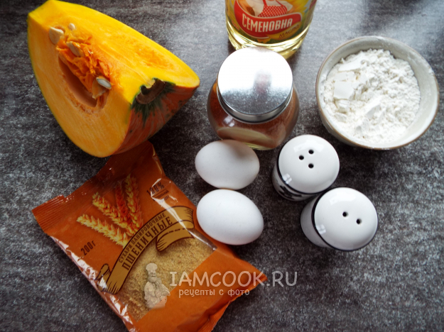 Набор продуктов для приготовления тыквы в панировке на сковороде - перед вами.