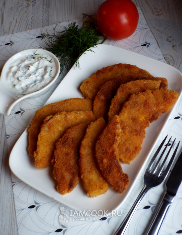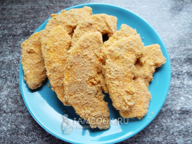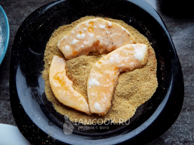 Обвалять в муке. В сухари добавить паприку. Яйца взбить вилкой и немного подсолить.