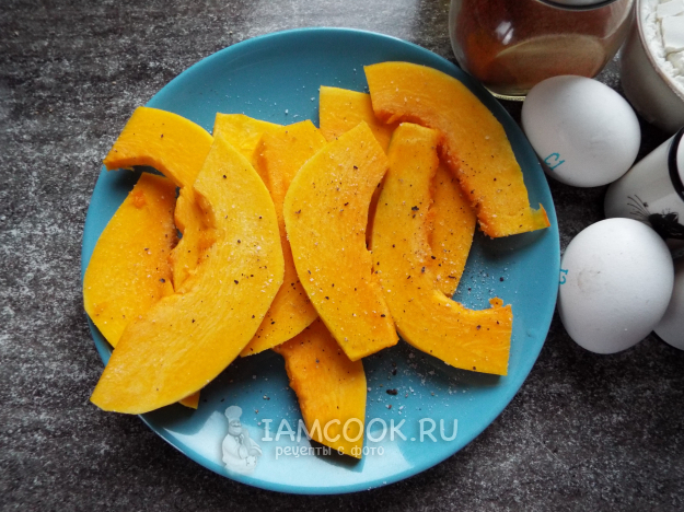 Тыкву нарезать тонкими слайсами. Немного подсолить и поперчить.