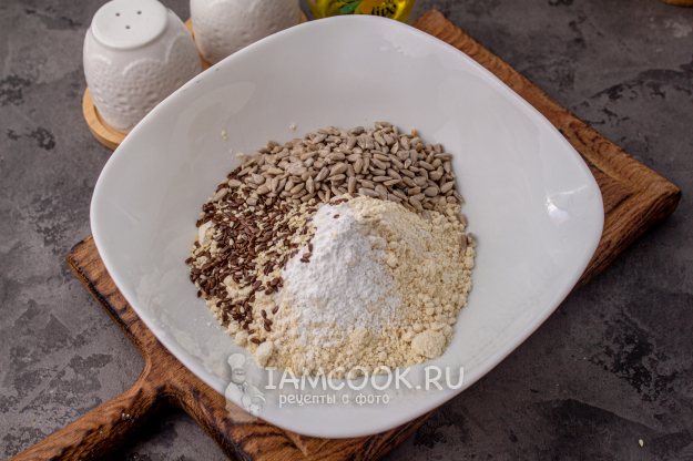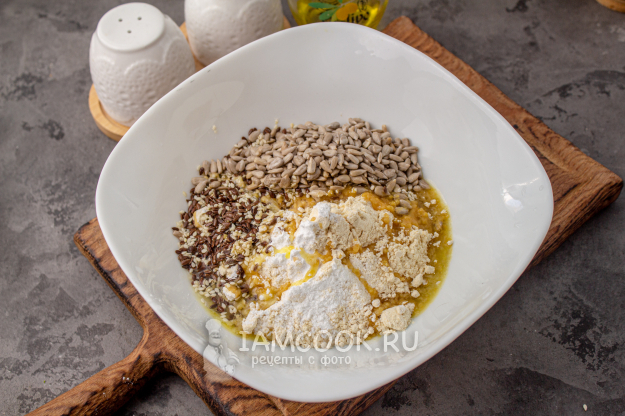 Всыпьте семена кунжута и льна и 2/3 части семечек подсолнуха.