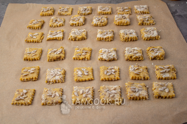 Выложите тесто на пергамент, присыпанный отложенной нутовой мукой, и раскатайте в тонкий пласт. Формочкой для печенья вырежьте печенье. Я использовала формочку небольшого диаметра, можно любую, которая у вас есть в наличии. На каждую заготовку слегка примните отложенные семечки подсолнуха. Поставьте в заранее разогретую до 180 градусов духовку на 7-8 минут. Это время приготовления для печенья небольшого размера, если вы вырезали печенье крупнее, то увеличьте время приготовления от 10 до 12 минут, а также ориентируйтесь на вашу духовку.