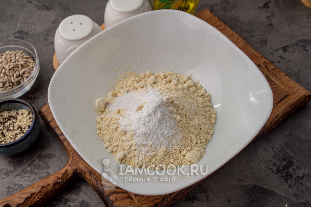 Все необходимые продукты для приготовления печенья из нутовой муки без сахара - перед вами. Семена льна и кунжута можете дополнить или заменить другими, например, семенами чиа, а семечки подсолнуха можно заменить или разбавить тыквенными, или добавить измельченные орехи.