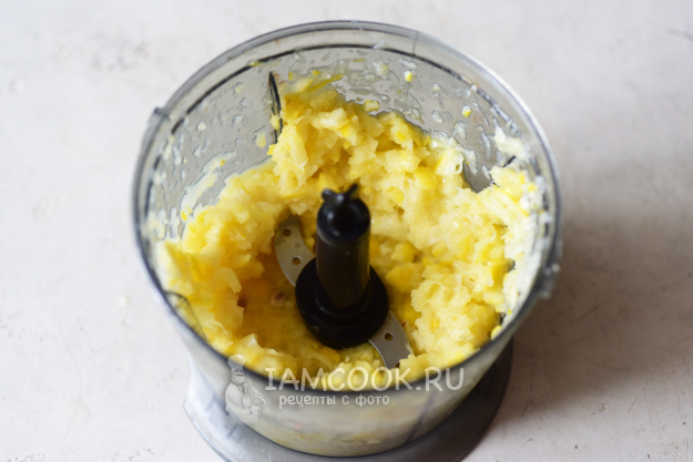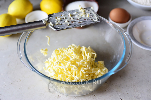 Достанем из морозильной камеры оставшееся тесто, освободим от пленки, натрем на крупной терке прямо поверх лимонного слоя.