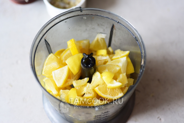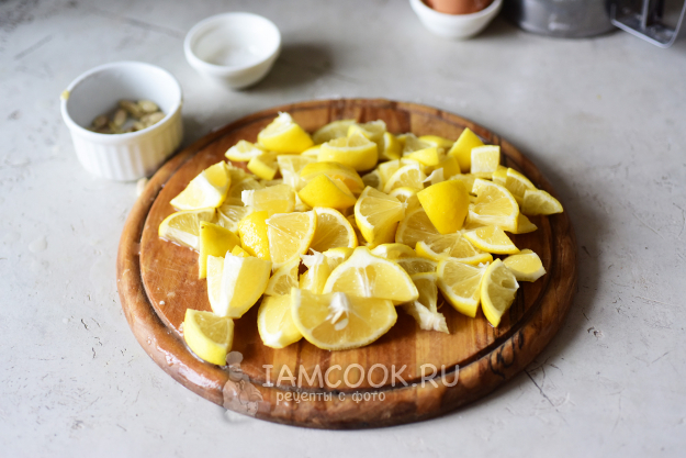 Прокипяченные лимоны разрежем на небольшие кусочки, по ходу процесса удаляем косточки.