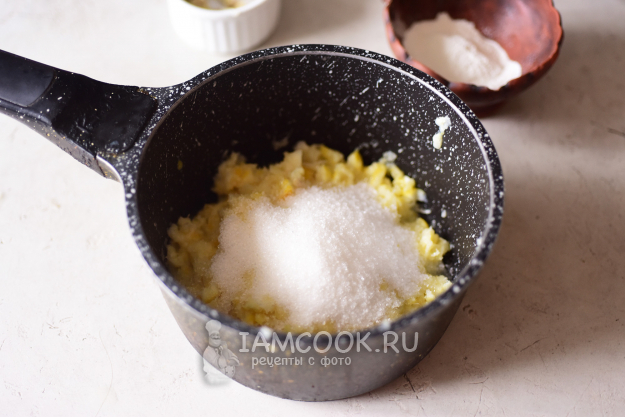 Лимонную массу выложим в сотейник, добавим 100 г сахара, на небольшом огне проварим лимоны до полного растворения сахара.