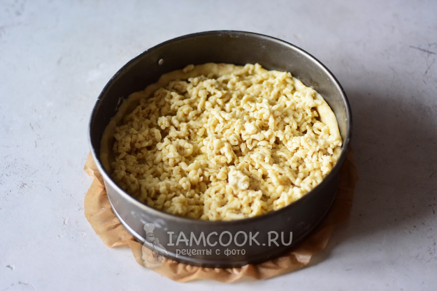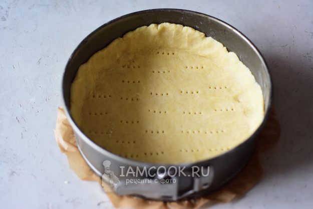 Большую часть теста выложим в разъемную форму, которую предварительно застелем пергаментом для выпекания. Сформируем (можно пальцами, а можно немного раскатать скалкой) основу с бортиками высотой примерно 3 см, наколем горизонтальную часть вилкой. Поверх разложим лимонную загустевшую массу, равномерно распределяя.