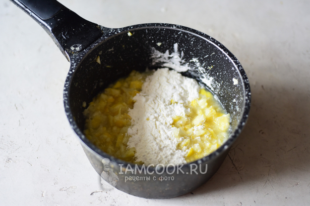 Просеем муку с разрыхлителем. Замесим быстро мягкое тесто, если нужно - немного добавляем холодную воду.