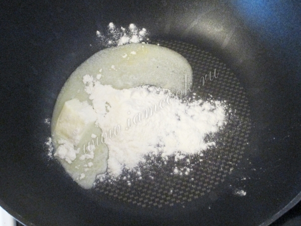 Для молочного соуса растопите на сковороде сливочное масло, насыпьте муку.