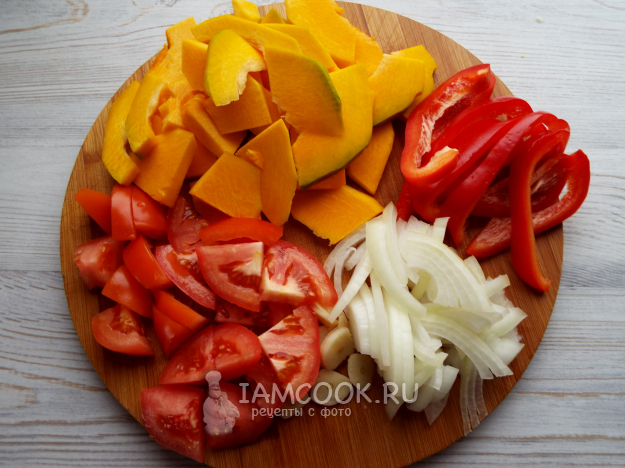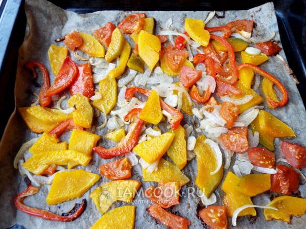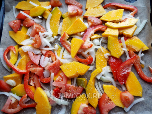 Запекать при 170 градусах до мягкости. Ориентируйтесь по тыкве, она готовится дольше всего.