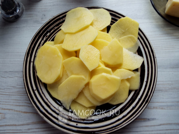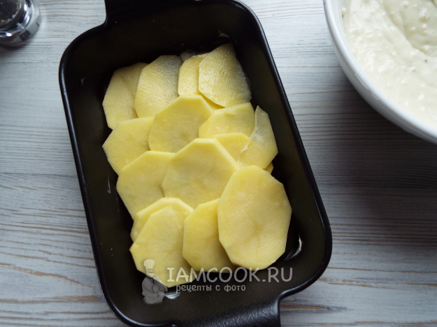 Форму немного смазать маслом, выложить слой картошки, можно немного внахлёст.