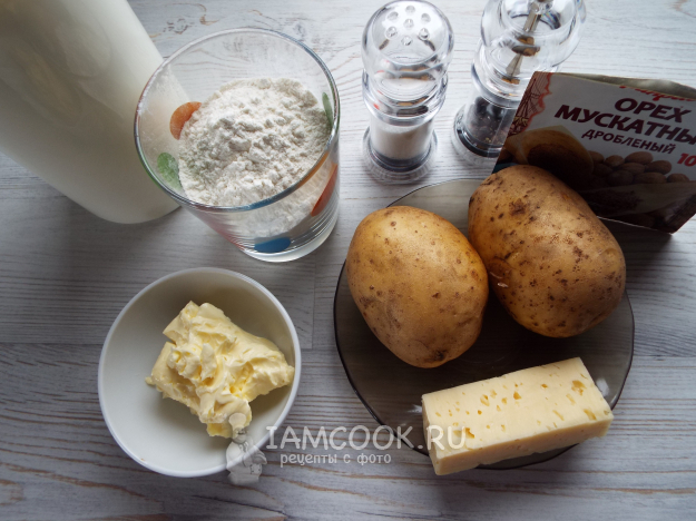 Картофельную запеканку с соусом бешамель готовим из продуктов, представленных на фото ниже.
