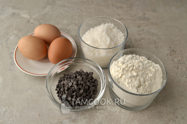 Приготовьте продукты по списку для выпечки бисквитного печенья с шоколадом.
