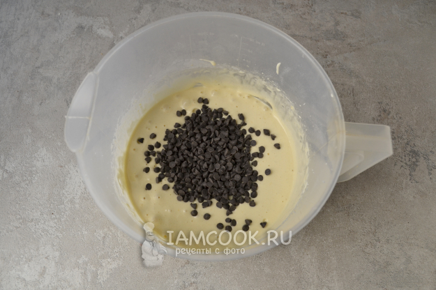 Еще раз взбейте миксером тесто и всыпьте шоколадные дропсы.