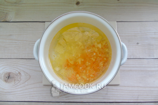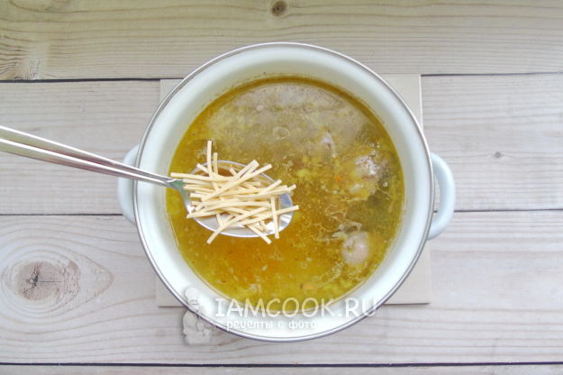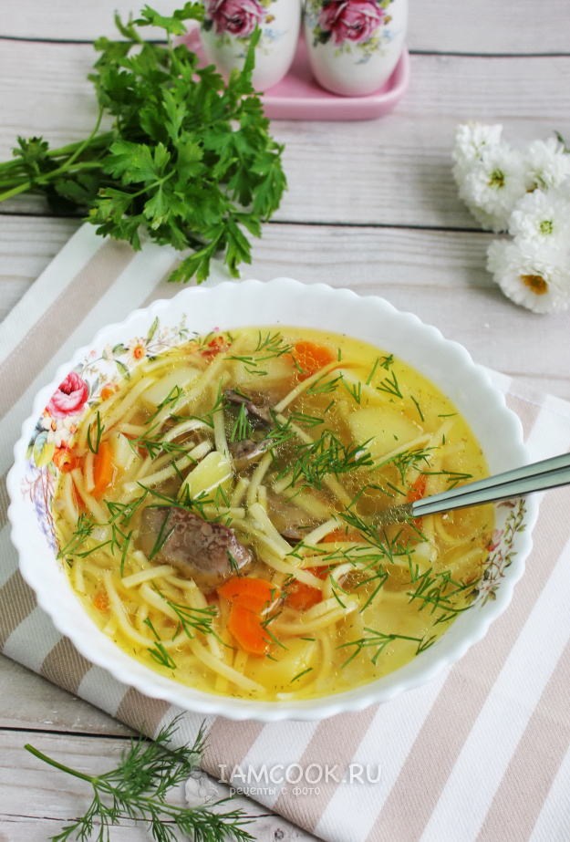 Когда овощи в кастрюле будут почти готовы, добавьте в суп куриную печенку и вермишель. Суп посолите по вкусу.