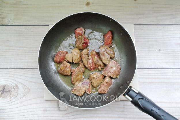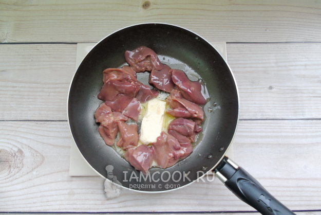 Тем временем куриную печень помойте, удалите жир и прожилки. Разрежьте на 2-3 части. Выложите в сковороду со сливочным маслом.