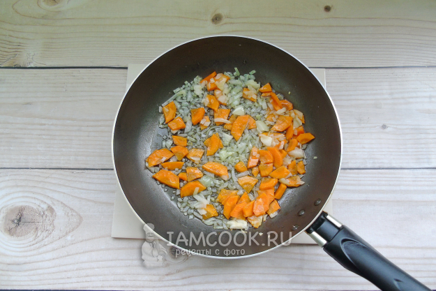 Морковь и репчатый лук очистите, помойте и нарежьте произвольно, но не крупно. Выложите в сковороду. Налейте подсолнечное масло и пассеруйте до прозрачности лука.