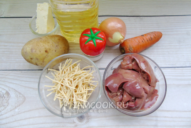 Для приготовления супа с куриной печенью и вермишелью возьмите ингредиенты согласно предложенному списку и фотографии.