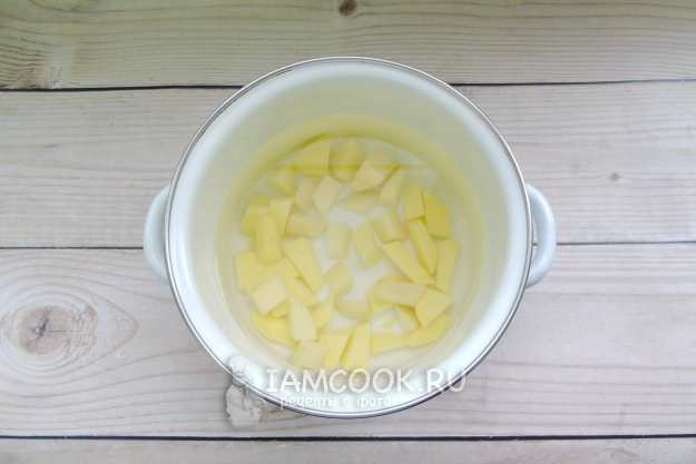 Картофель очистите, помойте, нарежьте. Выложите в кастрюлю и залейте водой. Поставьте кастрюлю на плиту и начинайте варить суп.