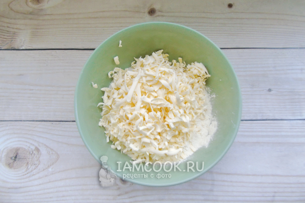 Сливочное масло предварительно заморозьте. Затем натрите на терке прямо в миску с мукой и сахаром.