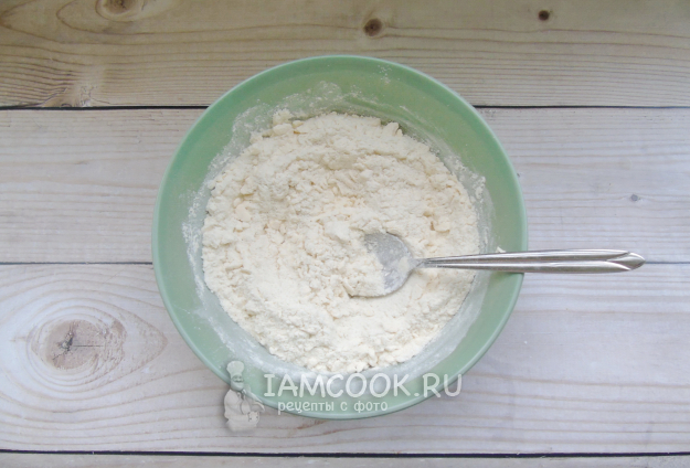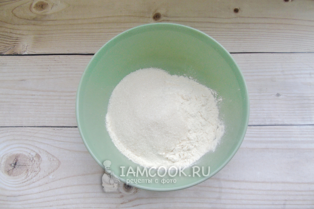 Тесто замешивать не нужно, что очень удобно. В миску насыпьте муку, сахар и разрыхлитель.