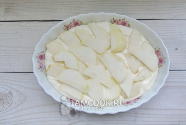 Груши помойте, очистите, удалите сердцевину и нарежьте пластинками. Разложите на творожной массе.