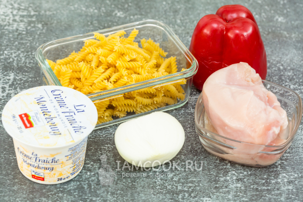 Для приготовления макарон с куриной грудкой в сливочном соусе подготовьте продукты по списку.