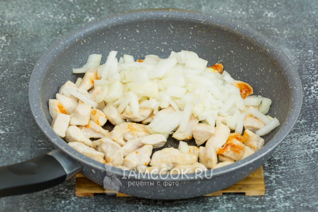 Куриное филе нарежьте небольшими кусочками и обжарьте до румяной корочки (нагрев - сильный).