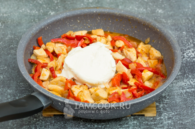 Добавьте сметану (сливки) и воду так, чтобы консистенция соуса вас удовлетворяла, но учтите, что макароны потом впитают в себя часть соуса. Добавьте соль и перец.
