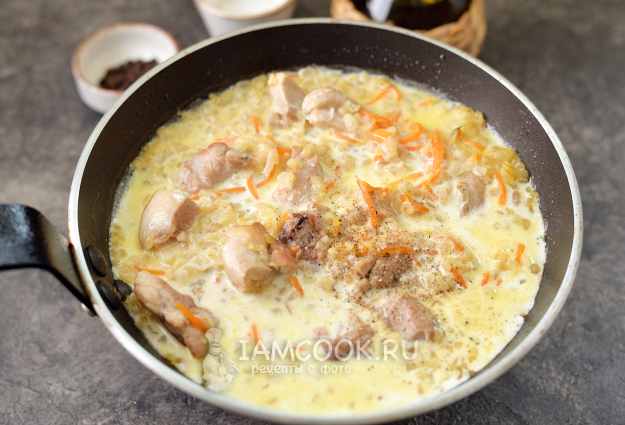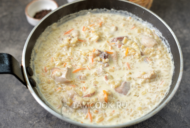 Готовьте булгур с курицей в сливках минуты 2, сливки должны хорошенько прокипеть и слегка загустеть. Выключите плиту, сковороду полностью накройте крышкой и дайте блюду постоять минут 5, крупа еще слегка набухнет и впитает немного сливок.