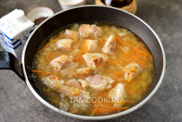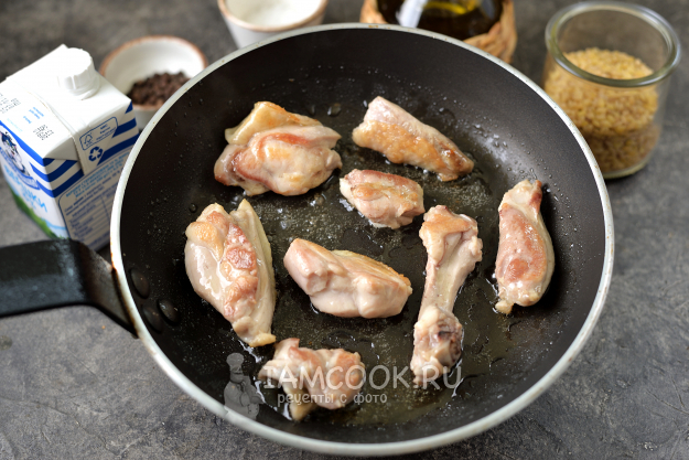 Куриное бедро нарежьте ломтиками, обжарьте в небольшом количестве растительного масла до слегка золотистой корочки.