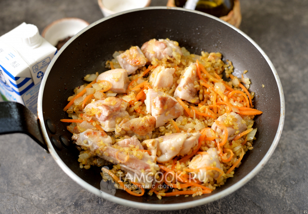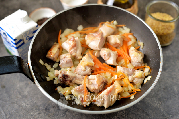 Всыпьте в сковороду промытый булгур, перемешайте.