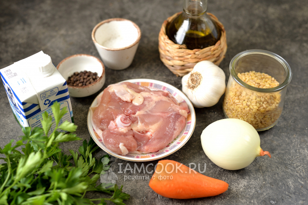 Соберите все необходимые ингредиенты для приготовления булгура с курицей в сливочном соусе. Лук, морковь и чеснок почистите, помойте вместе с курицей под проточной водой и обсушите.