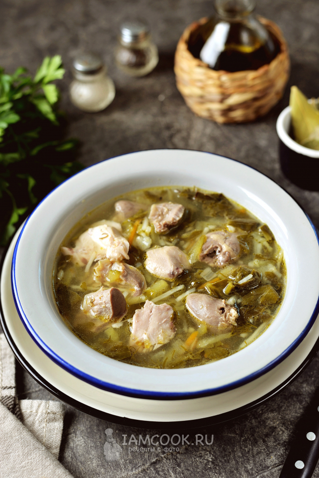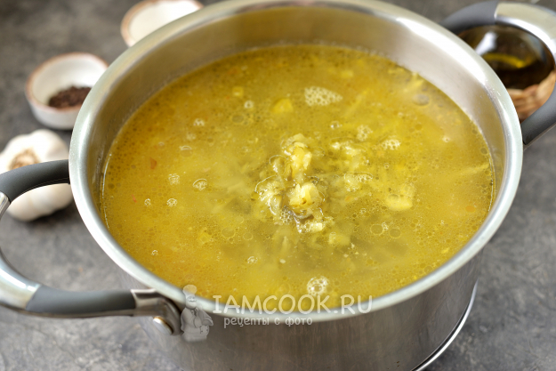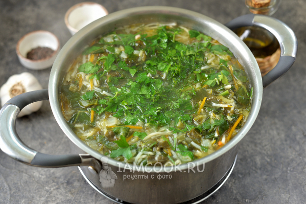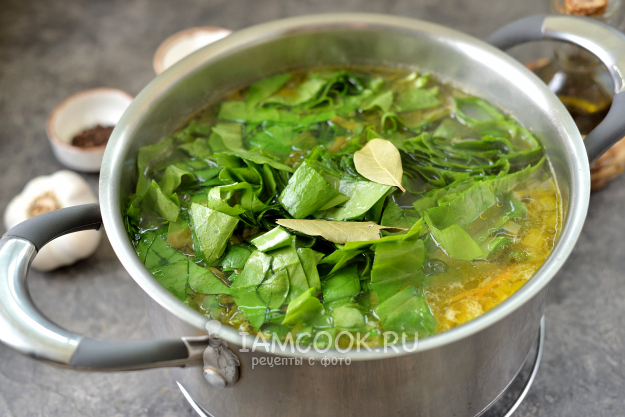 Тщательно промойте шпинат и щавель, отделите листья от стеблей, нарежьте их крупно, добавьте в кастрюлю вместе с лавровым листом, влейте рассол. Варите суп 5 минут, в процессе посолите и поперчите по вкусу, всыпьте немного сахара для баланса.
