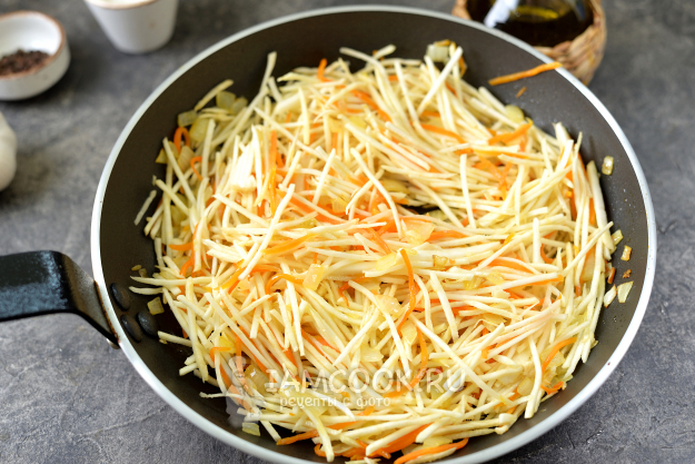 Корень сельдерея очистите от кожуры, натрите такой же тонкой соломкой, переложите в сковороду вместе с чесноком и обжарьте с остальными овощами пару-тройку минут. Я добавила только сельдерей, поскольку не нашла петрушку в продаже, а пастернак у нас просто не продается.