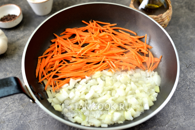 А пока разогрейте в сковороде растительное масло, обжарьте на нем нарезанный мелким кубиком репчатый лук и тонко нашинкованную морковь минут 5-7 на умеренном огне.