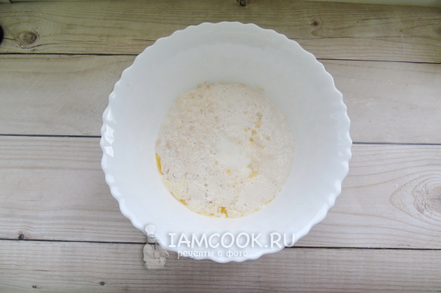 Затем растопите сливочное масло, немного его охладите и влейте в миску с молоком, водой, сахаром и дрожжами.