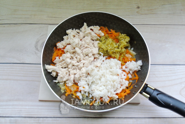 Затем добавьте курицу, отварной рис и нарезанный мелко или натертый на терке соленый огурец.