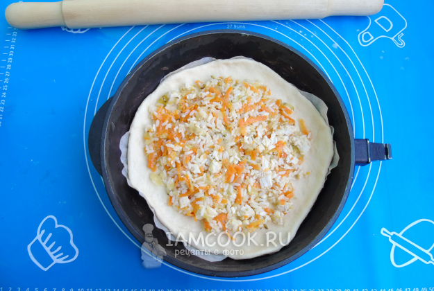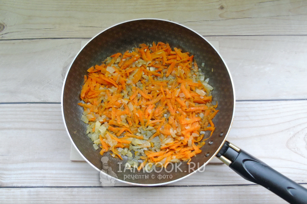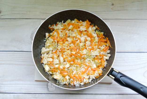Ну, а пока тесто подходит, приготовьте начинку. Удобно заранее сварить рис и курицу. Тогда приготовление начинки займет считанные минуты. Морковь и лук очистите. Лук мелко нарежьте, а морковь натрите на терке. Выложите в сковороду с подсолнечным маслом и пассеруйте до прозрачности лука.