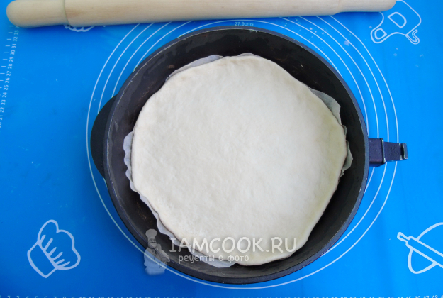 Когда тесто подошло, достаньте его из миски, обомните и разделите на две неравные части. Большую часть раскатайте в круг и выложите в форму с пекарской бумагой.