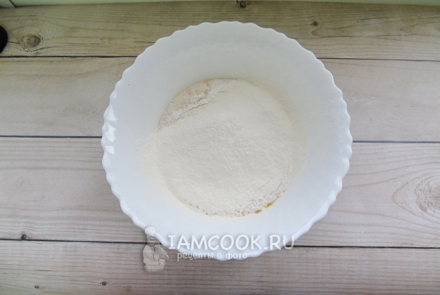 Добавьте соль и постепенно насыпьте просеянную муку.