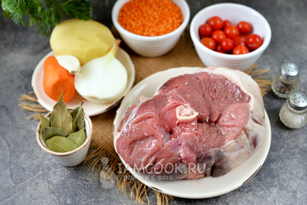 Для приготовления супа из баранины с чечевицей и картофелем вам понадобятся продукты на фото.