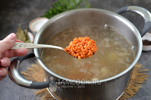 Сразу же добавьте хорошо промытую чечевицу. Варите суп 10-12 минут или до готовности картофеля.