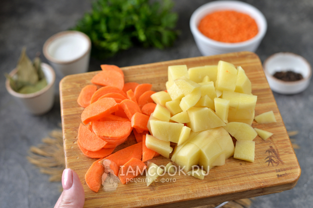 Спустя время нарежьте картофель кубиком и морковь тонкими ломтиками, переложите в кастрюлю.