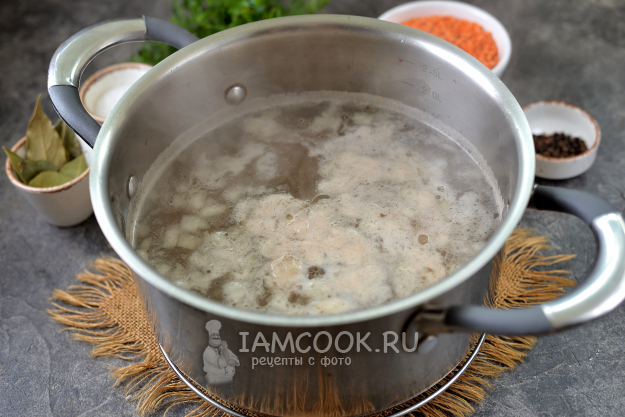 Соберите с поверхности супа остатки пены, всыпьте нарубленную зелень и выключите плиту. Суп обязательно должен настояться перед подачей, все вкусы смешаются, а чечевица отлично разбухнет.