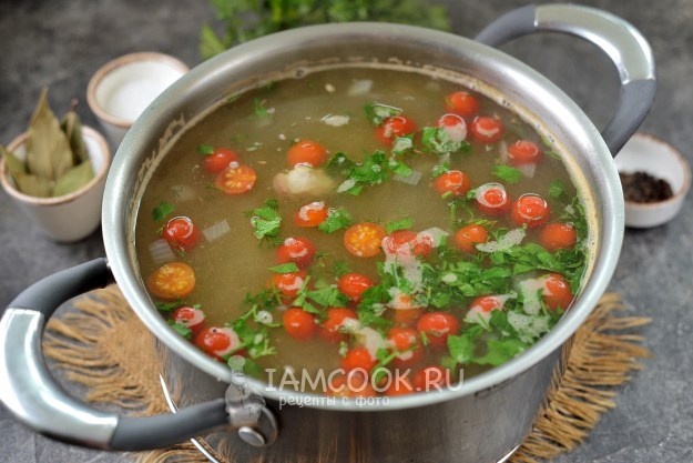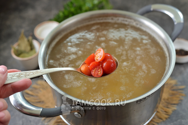 Долейте воды до верха кастрюли, добавьте помидоры или томатную пасту, их кислота отлично дополнит баранину. В процессе положите лавровый лист и раздавленный или нарубленный зубчик чеснока, при желании можно подсыпать щедрую щепоть зиры. Варите суп еще 5 минут, посолите и поперчите по вкусу.