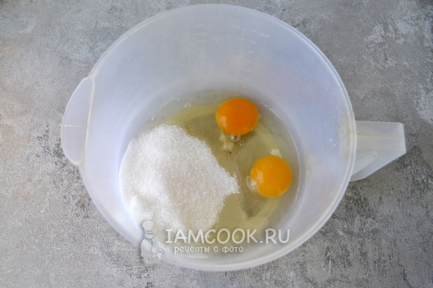 В миску для теста разбейте яйца и всыпьте сахар.
