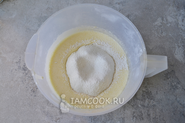 Просейте муку с разрыхлителем. Еще раз миксером взбейте тесто.