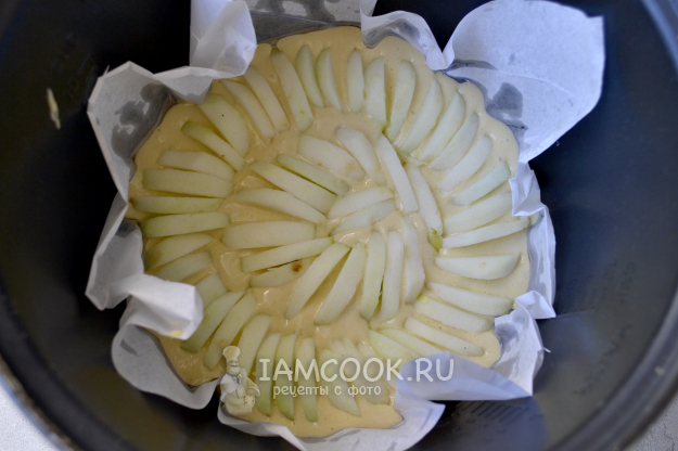Яблоки очистите и нарежьте на тонкие дольки. Утопите дольки яблок в тесте.