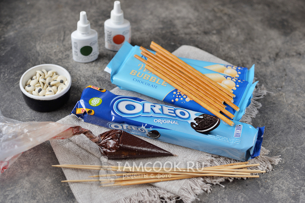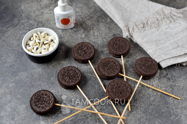 Воткните тонкие бамбуковые шпажки в белую прослойку между печеньями.